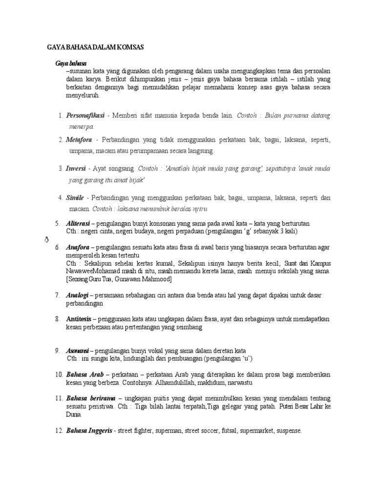 Personafikasi - Memberi sifat. Download View Nota Gaya Bahasa Dalam Komsas as PDF for free. Keindahan BahasaUnsur Gaya Bahasa dalam Genre Sastera 1.