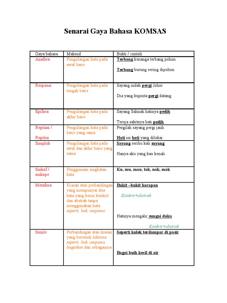 Repitisi repitasi pengulangan kata pada baris yang sama bagi menunjukkan penegasan yang dikehendaki. GAYA BAHASA DALAM KOMSAS Gaya Bahasa Dalam KOMSAS Gaya bahasa susunan kata yang digunakan oleh pengarang dalam usaha mengungkapkan tema dan persoalan dalam karya. KOMSAS - Gaya Bahasa.